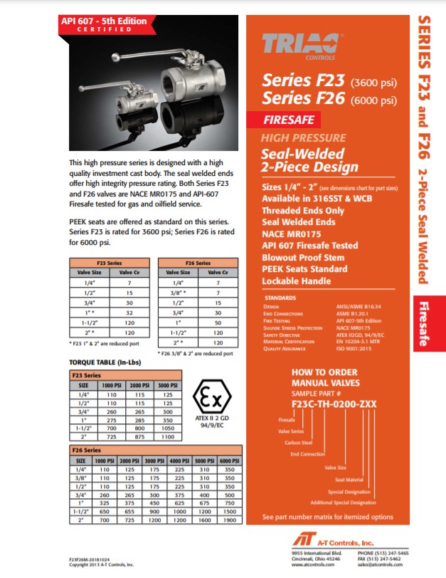 A-T Controls Triac F23 F26 Series high pressure series is designed with a high quality investment cast body. The seal welded ends offer high integrity pressure rating. Both Series F23 and F26 valves are NACE MR0175 and API-607 Fire Safe tested for gas and oilfield service.