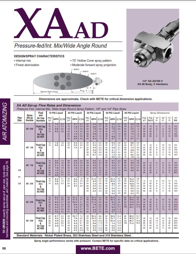 BETE XAAD spray nozzles use the energy in compressed air to produce highly atomized sprays at low flow rates. These nozzles produce eight distinctly different types of sprays, dependent on which interchangeable air and fluid cap is selected. The spray type and flow rate are determined by the “set-up”. a specific combination of one air cap and one fluid cap.