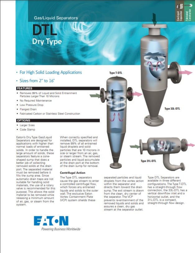 Eaton DTL Dry Separators have been designed for applications with a higher than normal load of entrained solids and are available in three different configurations. A straight-through flow connection, a vertical down-flow inlet and a horizontal outlet, and a compact, straight-through flow design.