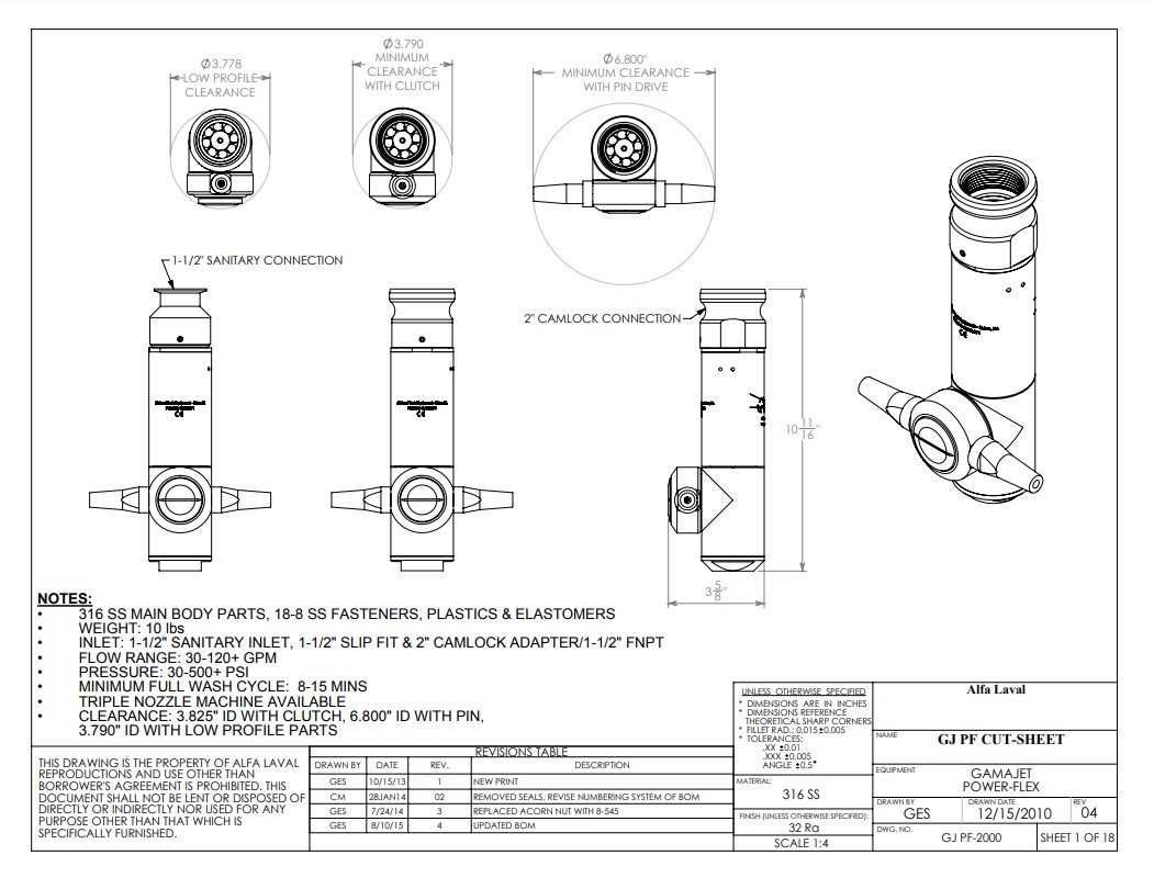 The Alfa Laval Gamajet GJ PF tank cleaning machine was specifically engineered to offer the most efficient and effective cleaning for vessels with capacities of 5,000 to 25,000 gallons. The durable machine offers optimal cleaning at a variety of pressures and flows. The sanitary design of the GJ PF makes it ideal for use in a variety of applications from food & beverage to transportation and chemical, for both portable and permanent applications. All components of the GJ PF are made from FDA compliant materials. The key to the GJ PF’s versatility and durability is the use of an oversized gear head that efficiently generates the proper torque to rotate the unit. The larger components last 20-30% longer than traditional drive mechanisms, making the GJ PF Alfa Laval’s most durable design to date. The large gear reduction allows the GJ PF to operate at lower pressures and higher flows when compared to other tank cleaning machines. Like other Alfa Laval tank cleaning machines, the GJ PF uses the same proven Alfa Laval impingement cleaning pattern, scouring 100% of the tank, every time.